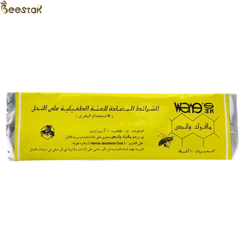 É feito de tau-fluvalinato, é um tipo de inseticida de contacto e de consumo sem volatilidade.Mostra o seu efeito letal quando tocado e transmitido aos ácaros da varroa pelas abelhas.Os varroas serão envenenados, enfraquecidos e mortos, e finalmente cairão.O tempo de utilização do medicamento deve durar de 21 a 28 dias sem período de larvas..